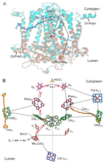 Photosystem II (PSII) is a large multisubunit membrane protein complex with at least 19 subunits. In physiological conditions, it exists as a dimer with a molecular weight of ca. 0.70 MDa and is embedded in the thylakoid membranes of oxygenic photosynthetic organisms [1]. PSII catalyzes one of the most fundamental reactions on Earth, that is, light-induced charge separation and water oxidation [1,2,3]. PSII initiates photosynthetic reactions by absorbing light through its internal antenna pigments. Light absorption leads to charge separation of the reaction center chlorophyll pigments, the so-called P680 molecules, and the process leads to the release of an electron and the formation of P680•+ and Pheo•− ionic radicals [4,5,6]. Then, the released electron serves to reduce the plastoquinone molecule in the QA site, and the QA/QA•− redox couple reduces a mobile QB with two consecutive electrons in the QB site, leading to the formation of plastoquinol (QBH2) after taking up two protons from the stroma. QBH2 then detaches from the QB site and moves into the plastoquinol pool in the membrane-spanning region [6]. The highly reactive P680•+/Pheo•− and the subsequent secondary radical pairs formed by charge separation can be stabilized by oxidizing the catalytic center—the Mn4CaO5 cluster, which is also called the donor site—via a redox-active tyrosine (D1-Tyr161). P680 has the highest redox potential known in biology, Em = 1.3 V (vs. standard hydrogen electrode [SHE]), which enables it to abstract electrons from and fully oxidize two water molecules by consecutively accumulating oxidizing equivalents in the Mn4CaO5 cluster during Sn-state transitions, where n = 0–4 [5,6].