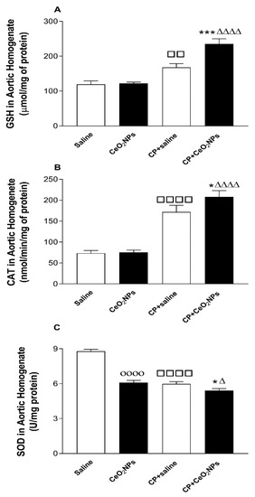 Glutathione (GSH, (A)) concentration in aortic homogenates of rats intratracheally instilled with either saline (n = 8) or CeO2 NPs (n = 8) with (n = 8) or without (n = 8) CP administration. *** P < 0.001 compared with CP + saline-treated group. ΔΔΔΔ P < 0.0001 compared with CeO2 NPs-treated group. □□ P < 0.01 compared with saline-treated group. Catalase (CAT, (B)) activity in aortic homogenates of rats intratracheally instilled with either saline (n = 8) or CeO2 NPs (n = 8) with (n = 6) or without (n = 6) CP administration. * P < 0.05 compared with CP + saline-treated group. ΔΔΔΔ P < 0.0001 compared with CeO2 NPs-treated group. □□□□ P < 0.0001 compared with the saline-treated group. Superoxide dismutase (SOD, (C)) activity in aortic homogenates of rats intratracheally instilled with either saline (n = 8) or CeO2 NPs (n = 8) with (n = 8) or without (n = 8) CP administration. * P < 0.05 compared with the CP + saline-treated group. Δ P < 0.05 compared with the CeO2 NPs-treated group. □□□□ P < 0.0001 compared with the saline-treated group. οοοο P < 0.0001 compared with the saline-treated group. Data are mean ± SEM.