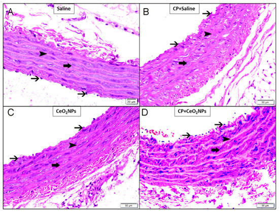 Figure 2 suggests that there were no significant light–microscopic differences in the H&E-stained aortic sections between the four groups studied (saline, CeO2 NPs, CP + saline and CP + CeO2 NPs groups).