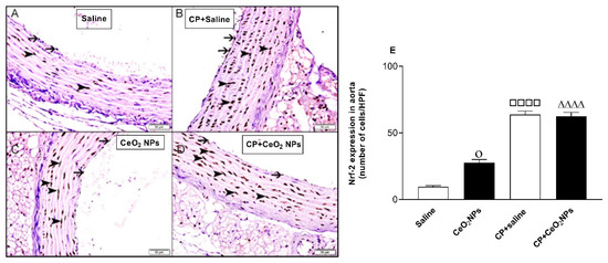 At the time point investigated, the study of Nrf2 expression, a transcription factor which plays an important role in the instigation of antioxidant enzymes to respond to oxidative stress, in aorta of saline-instilled control rats showed normal aorta with Nrf2 nuclear staining of a few endocardial cells and smooth muscles (Figure 3A,E). The number of nuclei of smooth muscles and endocardial cells stained with Nrf2 in CP + saline group (Figure 3B,E) was significantly elevated compared with that in the saline group (Figure 3A,E). Likewise, the numbers of nuclei of smooth muscles and endocardial cells stained with Nrf2 in CeO2 NPs (Figure 3C,E) were significantly increased compared with the saline group (Figure 3A,E). Moreover, the concomitant administration of CP and CeO2 NPs (Figure 3D,E) further increased the number of nuclei of smooth muscles and endocardial cells stained with Nrf2 compared with CeO2 NPs group (Figure 3C,E).
