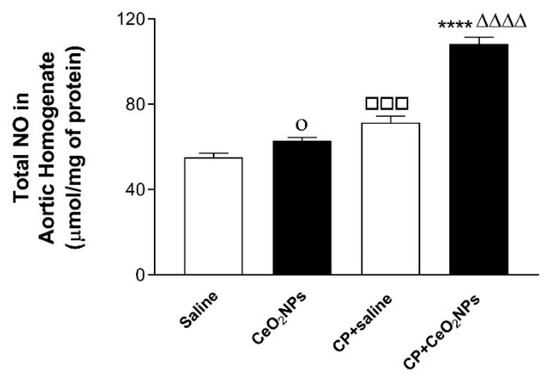 Total nitric oxide (NO) concentration in aortic homogenates of rats intratracheally instilled with either saline (n = 5) or CeO2 NPs (n = 5) with (n = 5) or without (n = 5) CP administration. **** P < 0.0001 compared with CP + saline-treated group. ΔΔΔΔ P < 0.0001 compared with CeO2 NPs-treated group. □□□ P < 0.001 compared with saline-treated group. ο P < 0.05 compared with saline-treated group. Data are mean ± SEM.