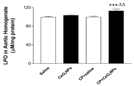 Aortic homogenates concentration of lipid peroxidation (LPO) in rats intratracheally instilled with either saline (control, n = 8) or cerium oxide nanoparticles (CeO2 NPs, n = 7) with (n = 8) or without (n = 7) cisplatin (CP) administration. *** P < 0.001 compared with CP + saline-treated group. ΔΔ P < 0.01 compared with CeO2 NPs-treated group. Data are mean ± SEM.