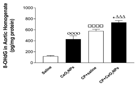 Aortic homogenates concentration of 8-hydroxy-2-deoxyguanosine (8-OH-dG) in rats intratracheally instilled with either saline (n = 6) or CeO2 NPs (n = 6) with (n = 5) or without (n = 6) CP administration. * P < 0.05 compared with CP + saline-treated group. ΔΔΔ P < 0.001 compared with CeO2 NPs-treated group. □□□□ P < 0.0001 compared with saline-treated group. οοοο P < 0.0001 compared with saline-treated group. Data are mean ± SEM.