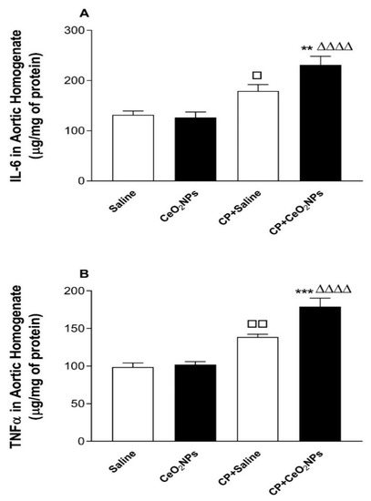 Aortic homogenates concentration of interleukin-6 (IL-6, (A)) in rats intratracheally instilled with either saline (control, n = 8) or cerium oxide nanoparticles (CeO2 NPs, n = 8) with (n = 8) or without (n = 8) cisplatin (CP) administration. Tumour necrosis factor-α (TNFα, (B)) concentration in aortic homogenates of rats intratracheally instilled with either saline (n = 8) or CeO2 NPs (n = 8) with (n = 8) or without (n = 8) CP administration. ** P < 0.01 and *** P < 0.001 compared with CP + saline-treated group. ΔΔΔΔ P < 0.0001 compared with CeO2 NPs-treated group. □ P < 0.05 and □□ P < 0.01 compared with saline-treated group. Data are mean ± SEM.