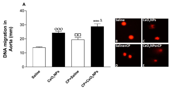 DNA migration (mm) in the aortic tissues evaluated by Comet assay in rats intratracheally instilled with either saline (control, n = 5) or cerium oxide nanoparticles (CeO2 NPs, n = 5) with (n = 5) or without (n = 5) cisplatin (CP) administration. *** P < 0.001 compared with CP + saline-treated group. Δ P < 0.05 compared with CeO2 NPs-treated group. □□ P < 0.01 compared with saline-treated group. οοο P < 0.001 compared with saline-treated group. Data are mean ± SEM. Images illustrating the quantification of DNA migration by the Comet assay under alkaline conditions in saline, CeO2 NPs with or without CP administration.