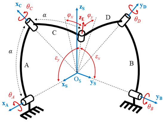The orientation mechanism is mounted at the end of the position mechanism and is made of a spherical decoupled mechanism (SDM) assembled as a 5-bar spherical linkage. It has been proposed and studied in 2018 as a mechanism that merges the kinematic advantage of decoupled architecture while maintaining a simple design compared to other decoupled mechanisms [19]. In 2020, its optimization into a manipulator for neuro-endoscopy has been reported, which shows that it is well adapted for orienting thin and light instruments [20]. As seen in Figure 2, this mechanism is made of four spherical linkages referred to as A, B, C and D. They are connected via a total of five revolute joints. The linkages A and B are connected to the mechanism base via two of these joints. The point OS is the origin of the reference frame and the location of the center of rotation, where all joint axes are intersecting. The axes xS and yS of the reference frame are, respectively, passing through the first revolute joint of the linkage A and B.