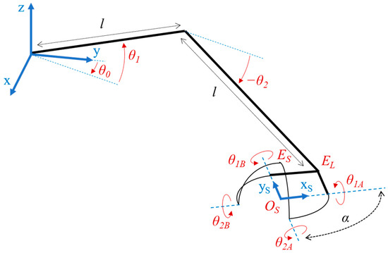 In order to simplify both kinematic and static balancing studies, all linkage dimensions are equal and are given by the length l for the position mechanism and the angle α for the orientation mechanism. A general kinematic representation of the 5-DoF SBM is given in Figure 3. It is assumed that the (OSxSyS) plane of the SDM will remain horizontal while being displaced by the position mechanism.