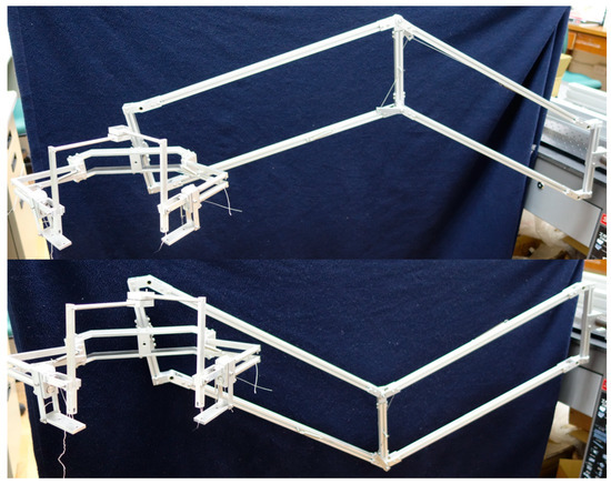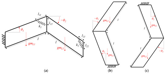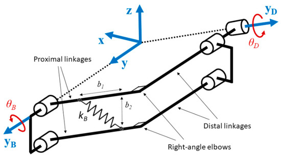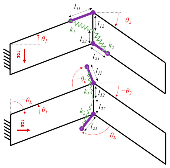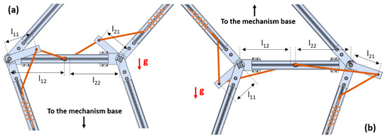 In the case of a horizontal parallelogram as seen in Figure 4a, the expression of the GPE is calculated by simply projecting the position of the center of mass and multiplying it by the gravitational constant g and by the mass of all moving linkages. For each parallelogram, the moving linkages include the distal transversal linkage and the longitudinal ones the synchronized rotation of which is given by the input variable θi (i = 1, 2). The proximal transversal linkage is not included. The tension spring has a stiffness given by the parameter ki and its attachment points on the longitudinal and transversal linkage are given by the parameters li1 and li2 respectively.