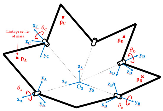 The evolution of its GPE will be studied for each linkage individually. Therefore, their height must be determined with respect of the mechanism configuration. The moving linkages of the SDM are referenced by the capital letter A to D. Their mass are given by the parameter mK, with K = A, …, D. A moving reference frame is associated to each moving linkage and the coordinates of their respective center of mass are given in these moving reference frames. They are referenced as {xK yK zK}, with K = A, …, D. A series of rotation matrices are then used to calculate these coordinated in the mechanism general reference frame. They will be expressed with respect to the mechanism joint coordinates. According to the mechanism revolute joint locations and curved linkage dimensions, the different rotation motions between the linkage reference frames are shown in Figure 6.