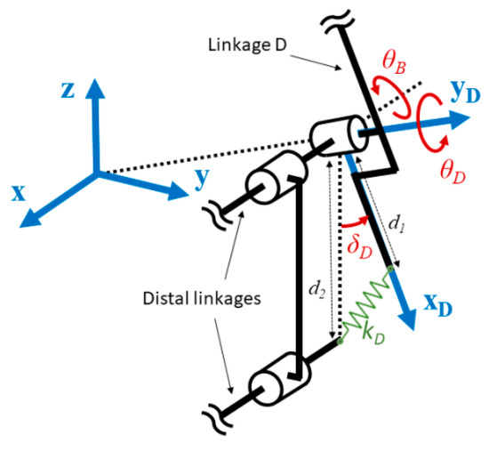 The GPE evolution of the linkages C and D is more complex as it depends on two angles at the same time. A mechanical concept illustrated in Figure 8 is proposed for the elongation of the spring. The linkage D is taken as an example. While this linkage is oriented by the angles θB and θD, the parallelogram design of the linkage B allows it be connected to a platform the orientation of which remains unchanged.