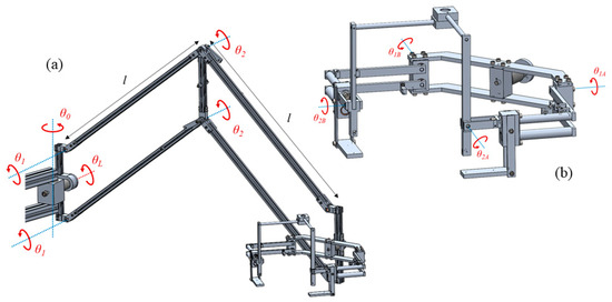where δC is the angle between the longitudinal axis of the linkage C given by the axis yC and the vertical axis passing through its center of rotation. Based on the mechanical concept shown in Figure 8 and on the kinematic associated with the second linkage of each arm, the projection given by angle δC can be replaced by a projection given by the angles θA and θC. Therefore, Equation (25) can be written as follows: