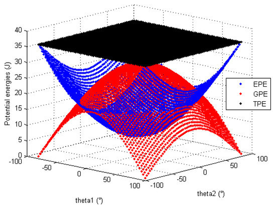 Based on the numerical values of the mechanical parameters identified in Section 5.2, a series of simulation is performed in order to verify that the static balancing of the mechanism is theoretically correct. The data in Table 1, Table 5 and Table 6 are used to display the evolution of the TPE, the GPE and the EPE of the entire position mechanism (considering the mass of the orientation mechanism) for any configuration given by θ1 and θ2. These energies are displayed for the three different working modes: horizontal in Figure 11, vertical upward in Figure 12 and vertical downward in Figure 13. All these graphics show that the conservation of the total potential energy is confirmed for any mechanism configuration of any working mode. Which proves the efficiency of the proposed mechanism concept for the uniformization of static balancing.