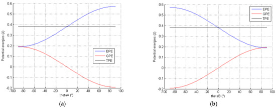 Once the mechanical concept has been defined to ensure the static balance of the mechanism, the objective is to determine the mechanical parameters required to satisfy the potential energy preservation for any configuration. The linkages A and B show a concept very similar with the classical parallelogram linkage. Based on Equations (16) and (23), the total potential energy of the linkage A is developed as follows: