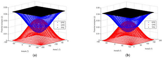 The same simulations are performed on the orientation mechanism. The data provided in Table 2, Table 3 and Table 4 are used to the study the evolution of the total potential energy of each SDM linkage. The evolution of the TPE, GPE and EPE for the linkage A, B, C and D are, respectively, displayed in Figure 14 and Figure 15. It is noted that the potential energies of linkages C and D depend on two variables.