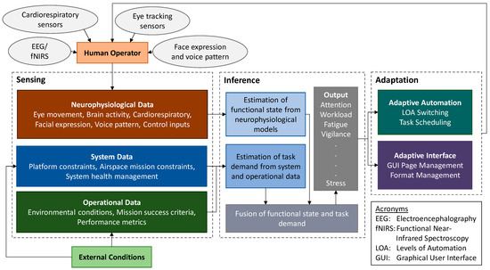 - Sensing—this module tracks both human and system environment aspects. For the human side, a variety of both remote and wearable neurophysiological sensors are exploited to monitor the neurophysiological parameters of operators in real time, along with control inputs from human operators. The system’s environmental sensing comprises of the system and operational data which are collected in real time;
