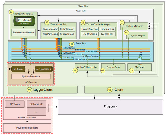 In addition to server and client components, core CHMI2 modules are also included in the system architectures shown in Figure 2 and Figure 3. These modules, outlined in red, are used to provide adaptive automation based on a sensing of the user’s neurophysiological state and are designed to be easily integrated with other applications outside of the multi-UAV case. The CHMI2 modules include:
