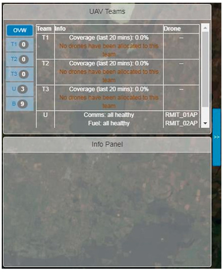 The Team Management (TM) Panel supports team and individual platform management by providing essential information on UAV teams, tasks, task progress, and platform system status. A UAV team is defined as two or more UAVs that are controlled together as a group, but do not necessarily have to be of the same type (e.g., in terms of sensor equipage) or perform the same task. The panel is located at the left side of the tactical map and as shown in Figure 4, is divided into two panes allowing the user to drill down to different levels of information. The top pane is the Summary Panel providing a summary of groups of entities while the bottom pane is the Info Panel providing more detailed information on the selected entity.