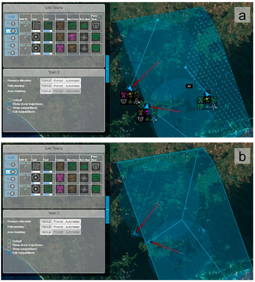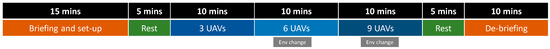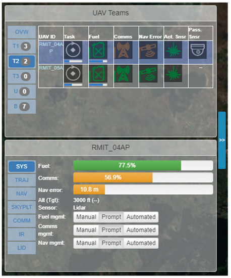 The concept of operations (CONOPS), experimental scenario, procedure, and participants have been previously presented and discussed [33,36,37]. In brief, participants assume the role of a remote pilot tasked with coordinating multiple UAVs in a bushfire surveillance mission. Participants are given primary and secondary mission objectives, with the primary objective focusing on maximizing the coverage of the surveillance task while the secondary objectives focus on monitoring and maintaining the on-board UAV system health. The sensor payload of each UAV comprises an active sensor (Lidar) and a passive sensor (IR). UAVs can be equipped with either one of the two sensors or both sensors, and each sensor has different range, field-of-view, and operating characteristics (e.g., the Lidar can only be used within the proximity of ground receivers scattered throughout the surveillance area). UAVs can be assigned to teams to perform coordinated search tasks over specific areas, allowing remote pilots to take advantage of team-level automated features. In planning the tasks of individual UAVs, the operator needs to account for several factors:
