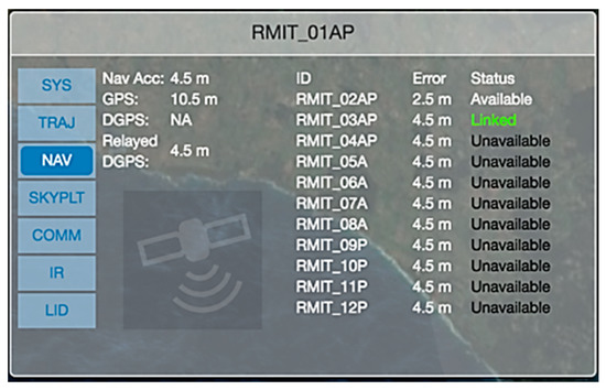 The NAV page in the UAV Info Panel showing the accuracy of different navigation sources and the navigation status of other UAV platforms.