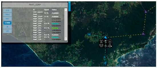 The remote pilot is required to monitor the communication link strength to ensure that excessive degradation does not occur during the mission. By default, a communication link is established directly between the UAV and the base, but this direct signal strength decreases with distance from the base. If the direct signal strength is weak, the communication link should instead be routed through other UAV platforms acting as communication relays. As shown in Figure 9, the COMM tab allows the remote pilot to view the estimated link strength of different relays. Additionally, when the COMM tab is selected, communication links are depicted on the tactical map as dashed lines, with blue dashed lines representing the communication links from upstream nodes (i.e., the UAVs which are relaying their communications through the selected platform) and the green dashed lines representing the communication links to downstream nodes (i.e., the platforms that are relaying the communications between the selected platform and the base).