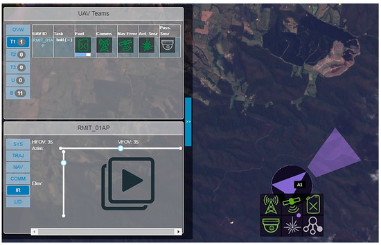 The UAV Info Panel provides additional details on UAV system health, supports control of sensors and systems, and allows the management of UAV automation modes. The panel is displayed when a UAV platform is selected, either by left-clicking on the platform on the tactical map or by clicking on the UAV via the Summary Panel. The UAV Info Panel is shown in Figure 6 and comprises several pages, which are displayed by clicking on the appropriate tab on the left side of the panel. These include a systems overview page (via the SYS tab), UAV trajectory page (via the TRAJ tab), navigation systems page (via the NAV tab), sky-plot page (via the SKYPLT tab), communication systems page (via the COMMS tab), and sensor system page (via the IR/VIS/LID tab). Each page provides detailed information on the given system, along with controls for the system, where available. Additionally, switching to a particular page would trigger visual changes in the tactical map to display information relevant to the given system.