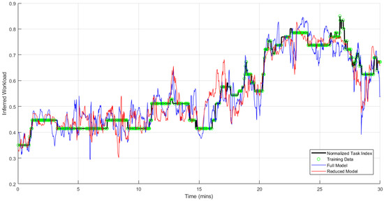 In the offline calibration phase, initial datasets were collected from the first experimental run to train the classification module. Since only data from two sensors (GP3 and Bioharness) could be streamed in real time, two separate ANFIS-based workload models (full/reduced) were generated for each participant. The full model was generated by training on the full set of neurophysiological features while the reduced model was generated using features obtained only from sensors that operate with real-time availability (i.e., the GP3 and Bioharness), with the intention of being deployed in the online adaptation phase. The inputs for training each classifier included the normalized click count, along with different neurophysiological features. The full model was obtained by training on normalized values of visual entropy, blink rate, heart rate, heart rate variability (HRV) (given by the magnitude of the two principal axes of the Poincaré plot, SD1 and SD2), FNIRS oxygenation, and blood volume, while the reduced model was obtained by training on the normalized values of visual entropy, blink rate, heart rate, and SD1. The normalized task index served as desired model output. The training produced fairly accurate models, with the full model providing a slightly lower error than the reduced model. Comparing the accuracy of the two models across all six participants, the root mean squared error (RMSE) for the full model was found to be 0.047 ± 0.025, while that of the reduced model was found to be 0.055 ± 0.030. The training results were generally similar across all participants, with Figure 18 showing the results from Participant 5′s dataset. The output from the full model was observed to be generally noisier than the output from the reduced model but more accurate due to the contribution of additional neurophysiological features not included in the reduced model.