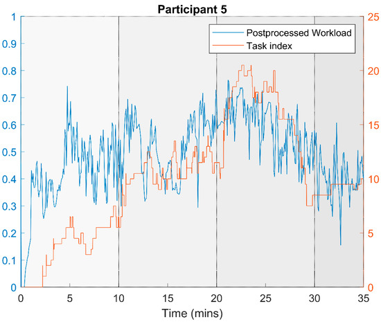 Participant 5’s inferred workload (blue) and actual task index (red).