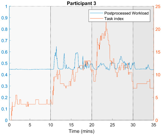 Participant 3’s inferred workload (blue) and actual task index (red).