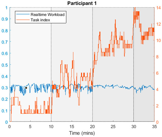 Participant 1’s inferred workload (blue) and actual task index (red).