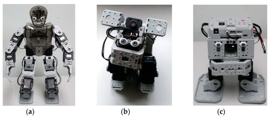 Robotis Bioloids: (http://www.robotis.us/robotis-premium/) Humanoid (a), Puppy (b), and Droid (c).