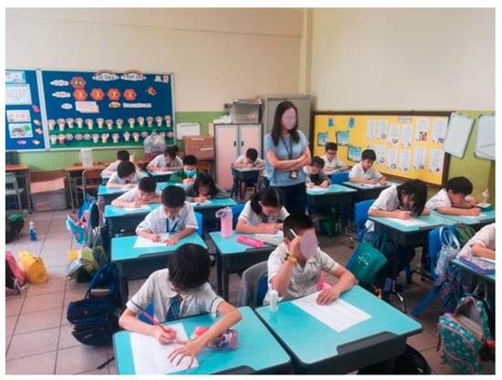 At the Free Methodist Bradbury Chun Lei Primary school, the experiment took place during three weeks on every Tuesday. The S.K.H. Good Shepherd Primary School had time for only one session. In class, the topic and procedure were introduced, and pupils took a 5 min multiplication pre-test consisting of 147 equations (Table 1, Figure 2). One week later, after class, the pupils from Chun Lei were asked to wait in the corridor before entering the experiment classroom (Figure 3).