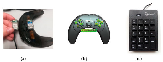 Wireless Bluetooth receiver (a), wireless controller (b), and number pad (c).