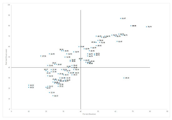 Therefore, we calculated the difference score from the final mean score (FinMSco)—baseline score = Final_minus_Baseline (Fin_min_Base). While 64 pupils gained from robot tutoring, there were 11 (about 15%) who did not perform better, but worse, after robot interaction (Fin_min_Base = −1 to −35). Ten of the worst performers came from the categories Below Average and Challenged, the remaining one coming from the Advanced category. In Figure 6, we show a four-quadrant scatterplot with pre-test baseline as the x-axis and post-test final score as the y-axis. The bottom right quadrant contains students who scored high on the pre-test (e.g., 65) but low on the post-test (e.g., 30). The bottom left quadrant has students who did not score too high on either the pre-test (e.g., 10) or the post-test (e.g., 21). These are the students who only learned a little. The top right quadrant contains students who scored high on both the pre-test (e.g., 78) and the post-test (e.g., 79). They too learned a little, but at a higher level. The top left quadrant shows students who scored low on the pre-test (e.g., 17) but high on the post-test (e.g., 51), showing the largest learning gains.