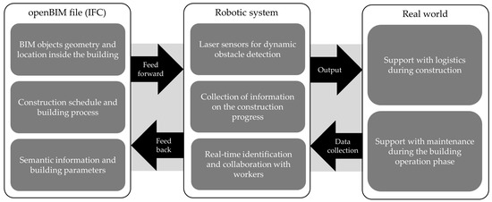 An overall summary of our applied research objectives is illustrated in Figure 1. The BIM interface enabled a bidirectional connection between the robotic system and the building database. In particular, the system could query the database for three kinds of information stored in BIM objects: (1) their geometric description and location with respect to the BIM file origin; (2) the information on construction scheduling, phasing, and process; and (3) the other metadata stored in pre-set and custom BIM parameters that semantically define the objects and areas of the environment. This information was provided a priori to the robotic system before operation. The system’s goal, as shown on the rightmost side of the picture, was to support construction and maintenance operation. The robotic system itself was provided with sensors to align the building model with the real world. The sensors were also employed to detect unforeseen obstacles, which were expected due to the unstructured environment of the construction site. Finally, the system identified workers in order to collaborate with them during operations. The same workers could input information on the construction progress in order to update the initial parameter value in the BIM database.