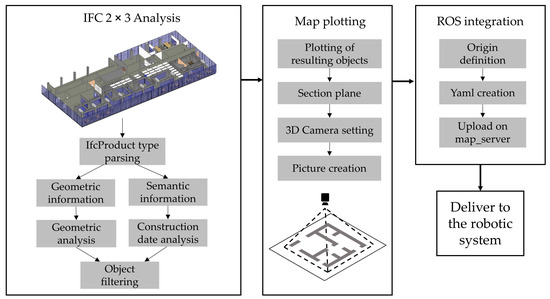In our research, the BIM interface was used for the creation of BIM-based time -dependent occupancy maps for robotic navigation (see Figure 2). We implemented four-dimensional scheduling metadata linked to BIM objects (i.e., planned starting and ending construction dates), which were exploited to create different static maps of the same building floor that followed the construction progress. These dates were specified through custom parameters created in the BIM authoring software (i.e., Autodesk Revit© in this case) before exporting the project in the IFC 2 × 3 format. Our pipeline parsed the IFC and stored the information about the BIM objects it contained. Thereafter, it filtered them based on two criteria: first, whether they posed a potential threat of collision with the mobile robot, and second, whether they had been built at the date and time at which the interface inquired. The objects that were not filtered out after the geometric and scheduling analysis were then sectioned by a plane. The meshes resulting from the intersection were plotted into a pgm image file by exploiting the Qt-based 3D Viewer of Open CASCADE [30]. In order to generate a grid map readable as an ROS costmap, that is, a binary map representing the obstacles of the environment with black pixels over a white background [31], the camera was set at the top of the picture and rendered it in black and white. Finally, the map was integrated into the ROS navigation stack [32]. This was achieved by uploading the map on the ROS node map_server [33]. This node loaded the yaml file linked to the map, which contained additional information such as the map origin and scale. At the end of this process, the map was successfully delivered to the robotic system.