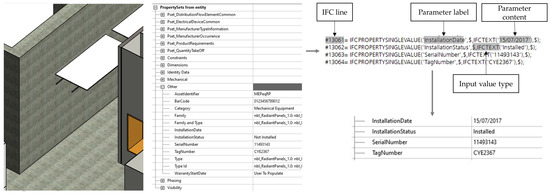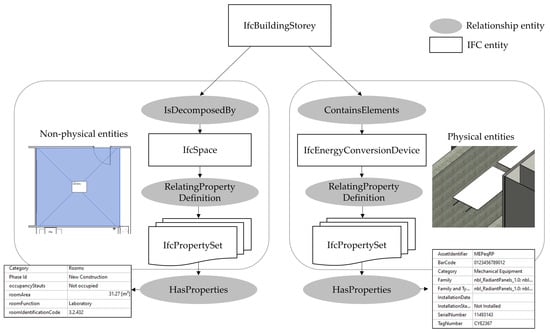 As shown in Figure 1, the last objective of the BIM interface was the extraction and modification of BIM object parameters. We focused on two specific BIM objects types for the sake of providing examples of processing physical and nonphysical BIM entities. Figure 3 shows the chain of elements, distinguished into IFC and relationship entities, that connected the building floor to a specific element and its property sets. This figure focuses on IfcSpaces [34] as representatives of nonphysical entities and on IfcEnergyConversionDevices [35] as representatives of physical entities. In the open BIM definition, IfcSpaces are three-dimensional volumes that define rooms that are actually or theoretically bounded. Thus, they are meant to describe the functions of building rooms, such as, for instance, meeting rooms, laboratories, and office spaces. The BIM interface extracted the geometric description of these IfcSpaces linked to their function and room code. Other parameters could concern, but were not limited to, storage spaces during the construction phase or daily room occupation status during the building operation phase. IfcEnergyConversionDevices are an example of how MEP elements were represented in BIM. MEP elements were chosen as they represent elements produced off-site that need to be installed during the construction phase and regularly maintained during the operation phase. Thus, they provide a comprehensive example of a BIM object characterized by specific information parameters that are shared among stakeholders from different fields and that are used throughout the building lifecycle. They are characterized by the parameters of their off-site producer, such as object code, serial number, and warranty information, and they are often linked with external documents on the use and installation process. During construction, they can be linked with parameters on scheduling, such as installation status and installation date. After these parameters were retrieved by the BIM interface, it was possible to identify the line in the IFC project where the parameter content was stored to potentially change its content. Upon importing the IFC into building software tools, the parameter was listed with the updated information to provide feedback from the robotic system to the construction stakeholders.