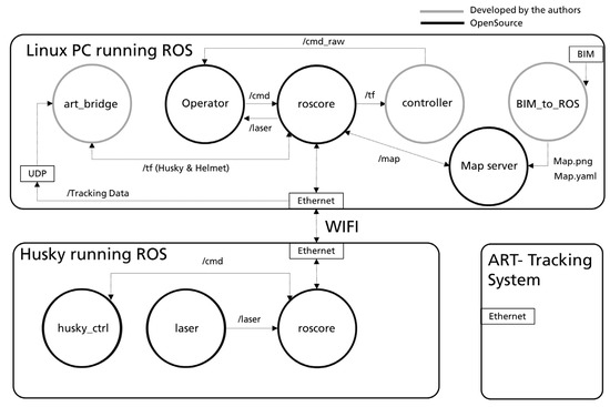 The overall software architecture of the system is shown in Figure 5. Here, we distinguished between nodes that we developed and those available as open-source nodes or ROS packages. The PC on the MRP ran one of the master nodes named roscore. This node interfaced the LIDAR scanner-generated messages (/laser) and a node that controlled the MRP (husky_ctrl). A second roscore was run by the control PC. It enabled: (1) the art_bridge node, which interfaced the data coming from the tracking system to tf-messages [41] in the ROS, (2) a controller node for the follow-me algorithm, (3) the nav2d package [42], visualized as the Operator node in Figure 5, that included nodes for various purposes (such as mapping managing, trajectory planning, and obstacle avoidance), and (4) a node for the map server, which fed the static map coming from the BIM-interface into the global costmap.