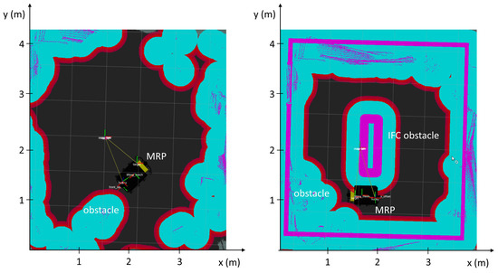 In the first application, the BIM integration was used to increase the robustness of robotic navigation. In particular, the BIM-generated time-dependent obstacle map was superimposed onto the map based on the LIDAR sensors from the MRP in order to avoid specific areas in certain time frames. The creation of the map followed the procedure shown in Figure 2. We conducted experiments on the first application in a laboratory environment to test the effectiveness of the proposed method. A simple IFC file was used that contained only the lab boundaries (i.e., walls and access door) and an element in the center of the room representing an unsafe area on the ground. The section plane was placed at the same height of the LIDAR sensor. The no-go area could, for instance, highlight where undetectable elements had been posed on the ground and which should not be moved by the MRP (e.g., electrical cables, measuring tapes). We considered other small obstacles that can be commonly found on construction sites, such as debris or unlevelled floor parts, to be negligible since we expected that the MRP would be able to drive over them, as the LIDAR was positioned under the plane passing through the center of the wheels. As shown in Figure 7, there was no distinction between the BIM-generated virtual obstacles and the ones dynamically detected by the LIDARs. Therefore, the MRP adjusted its trajectory to avoid both.