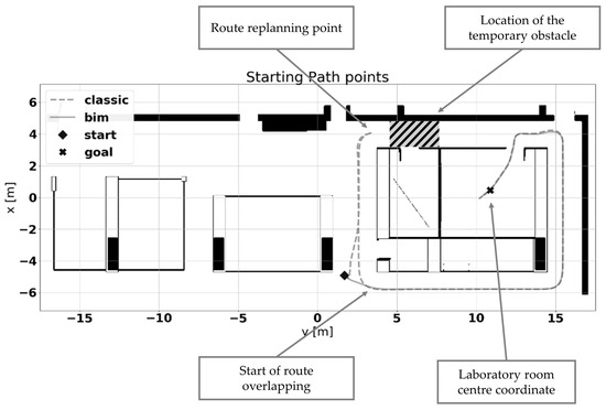 Figure 9 shows a comparison of the followed path in two scenarios. The dashed line indicates the path followed when the temporary obstacle was not known a priori. In this case, the MRP had to reach the temporary obstacle location before understanding that the way was blocked. From there, it replanned its route. The continuous line represents the path followed considering the presence of the temporary obstacle, as enabled by integration with the BIM model. This represents an example in which the BIM integration strongly aided navigation.