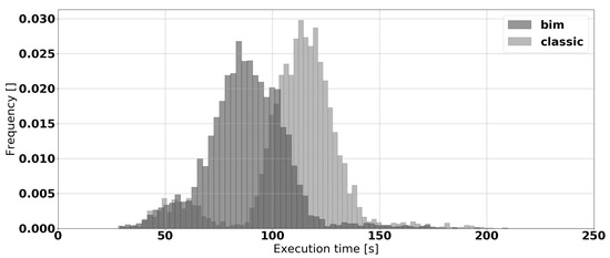 The experiment described was performed 4500 times for each map—for a total of 9000 times—in simulation. For every execution, a random starting pose of the robot was automatically initialized. As the goal pose the robot was asked to reach the laboratory at the top right corner. Figure 10 shows the distribution of the measured execution times (including the planning and path following phases). The distribution clearly shows a higher performance overall of the system with the a priori knowledge of BIM. The BIM-integrated navigation execution times were between 50 and 125 s, depending on the path length. Without provision of the BIM-based map, the same routes were completed with execution times between 50 and 150 s due to the lack of prior knowledge about the temporary obstacle. Thus, thanks to the BIM integration, the system generally performed the same task in less time.