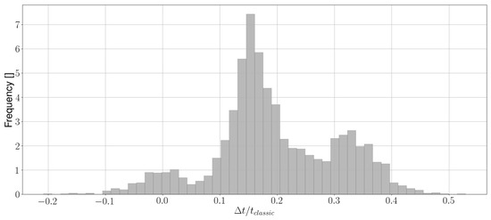 Figure 11 presents the time differences for the execution times of the navigation task from the same starting location. In some of the experiments, the execution time was only slightly inferior or even better without the use of the BIM map. This happened when the random path did not intersect the temporary obstacle. In these cases, the BIM knowledge did not improve the navigation time. In contrast, when the path passed through the area where maintenance works were taking place, the BIM integration could save between 20 and 60 s of execution time. The distribution in Figure 11 is trimodal and it presents three distinct peaks:
