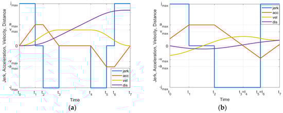 As in [20,21,22], we work with a so-called 7-segment motion profile, shown in Figure 1. It is based on a piecewise constant jerk function together with initial conditions on velocity and acceleration. In this profile, the motion function has, at most, 4 segments where the jerk is and, at most, 3 segments with zero jerk. In the classical RR situation (“rest-to-rest”, see Figure 1a), the sign pattern of the jerk segments is , but we allow arbitrary patterns such as to occur in order to have full coverage of all possible configurations as will be seen later. Formally stated, we have: