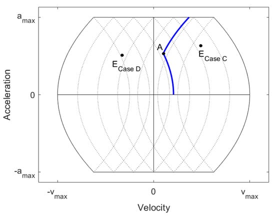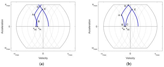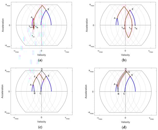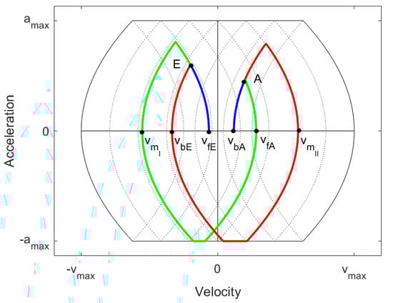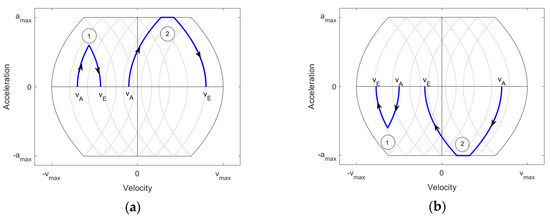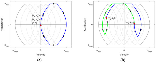 In order to visualize the change of velocity and acceleration in such seven-segment motion functions, Broquère [20,21] introduced the velocity–acceleration plane, shown in Figure 2. In this plane, motion functions are displayed mathematically as parametric curves . When one assumes that or 0, then the curves “move” along square root curves or horizontally (e.g., from and one obtains ). The square root curves can be of the kind (open to the right) or (open to the left) with constants . We assume that the horizontal motion only occurs when since otherwise, faster motion is possible. Motion along the square root curves is only possible clockwise since when the acceleration is positive (resp. negative), the velocity must increase (resp. decrease). The only points where a fast motion function might stay for a time of length >0 are the points (,0). This is the case when there is a segment with zero jerk and acceleration. Figure 2a shows a representation of the classical RR situation where and are reached. Note that only points within the area bounded by the left and right square root curves and the horizontal lines at and are admissible since only those points can be reached from (0,0) and one can go back from there to (0,0) without violating the restrictions (a larger opening of the square root curve corresponds to a higher value of ). The velocity–acceleration plane has one particular “pitfall” where misunderstandings can easily occur, so special care is called for: It does not show the distance ∆s, and this distance heavily depends on where in the velocity–acceleration plane a curve is placed. The length of the curve has nothing to do with the distance ∆s. The blue curve in Figure 2b depicts the motion function of Figure 1b (with positive ∆s) in the velocity–acceleration plane. The green curve has the same initial and end conditions but a negative value for ∆s.