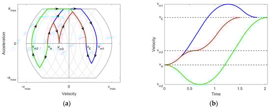 Examples for getting from to : (a) velocity–acceleration plane; (b) velocity over time.