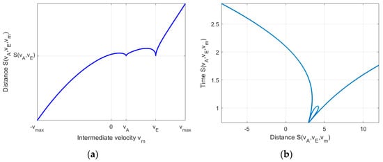 Figure 5a shows that depending on the given distance, there are up to five solutions to the motion problem using an intermediate velocity . Five solutions occur when the given distance is slightly above . This also shows that the fact that, at any time, one of the restrictions is taken does not guarantee optimality. Figure 5b shows which solution is the fastest one; for a given distance, the lowest intersection of the vertical line at that distance with the curve provides the best solution. One can also observe that the best time is discontinuous over the given distance. In [22], Sidobre and Desormeaux also provide examples for this phenomenon. They also use a parametric curve of distance over time needed, but they use a different parameter (time).