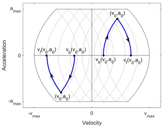 In this section, we consider the general case where initial and final velocities and accelerations can be arbitrary. We start with introducing some auxiliary functions that will be helpful in the later exposition. For an arbitrary admissible point in the velocity–acceleration plane, is defined to be the velocity for which the following holds: If you start at the point and apply minimum (resp. maximum) jerk if (resp. ), then you reach . The index b here stands for “backward”, i.e., going backward from . Figure 6 illustrates the definitions. Analogously, is defined to be the velocity for which the following holds: If you start at the point and apply maximum (resp. minimum) jerk if (resp. ), then you reach . The index f here stands for “forward”. An easy computation yields:
