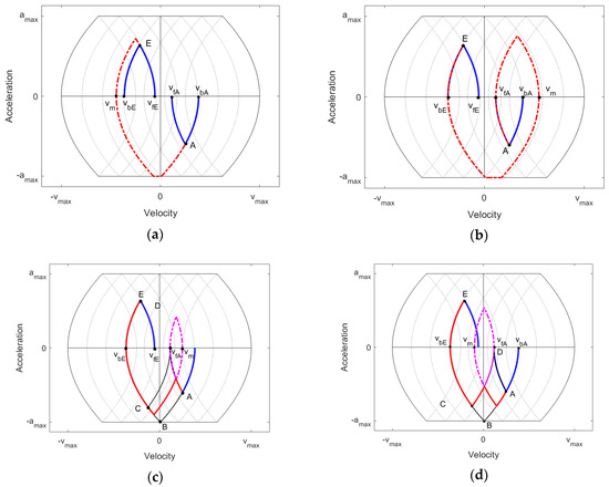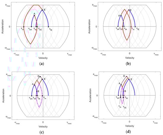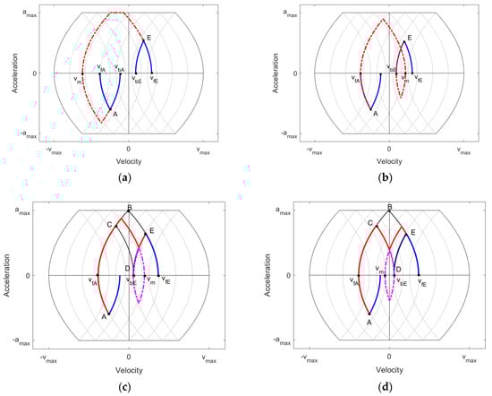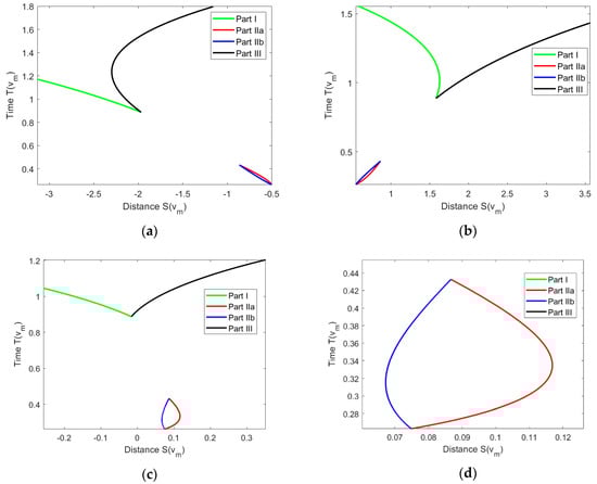 As in case A, we split up the construction of solutions for all distances into different parts, as shown in Figure 15. With Part I resp. III, we can realize arbitrarily small resp. large distances going via intermediate velocities resp. . If equality holds, then Part I and Part III provide the same point and, hence, the same distance Δs. Therefore, Parts I and III already cover all distances but do not necessarily provide the shortest time. Some distances can be realized better by going directly within the curved quadrilateral ABED using the sequence , , in Part IIa or the sequence , , in Part IIb (see Figure 15c,d). We will give an example for this situation below.
