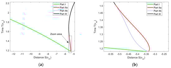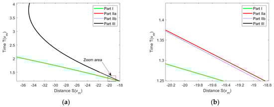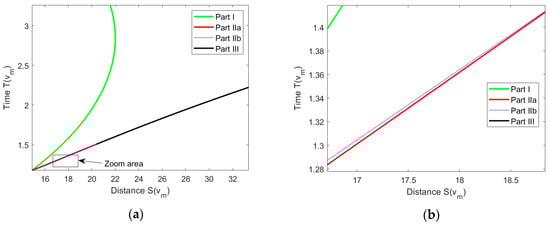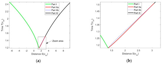 Initial and final conditions: . Note that the colors used in the following figures have nothing to do with the colors used in Figure 7. The corresponding curve is shown in Figure 8a, where the green part (Part I) goes on to the left, covering arbitrarily small (negative) distances, and the black part (Part III) goes on to the right, covering arbitrarily large distances. One can see that Parts I and III cover all distances but Parts IIa and IIb provide solutions needing less time in the interval of distances where they are valid. There is no huge difference between Parts IIa and IIb, but when zooming in (Figure 8b), one can see that, in this example, the red part (Part IIa) is better. Figure 8 also shows that for a given distance, there might be several solutions in different parts or in the same part, as we have already recognized in the GG situation in Section 3. For example, for the distance Δs = 18, there are two solutions in Part I and one solution each in Parts IIa and IIb.