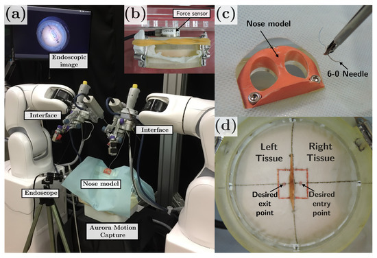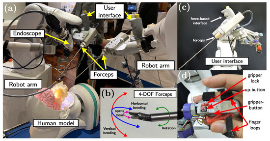 The proposed method is implemented on the system we have developed in [4] (see Figure 2a) composed of two 6-DOF industrial robot arms (VS-050, DENSO Corporation, Aichi, Japan), 4-DOF articulated forceps developed in [32], and user interfaces attached to the robot arms [4]. Each robotic unit has a total of 10-DOF, where 6-DOF are provided by the robot arm and 4-DOF are the contribution from the articulated forceps. The 4-DOF articulated forceps (see Figure 2b) comprises a shaft (diameter: 3.5 mm and length: 233 mm), a triangular-shaped gripper (length: 4 mm), and elastic elements to provide 3-DOF tip movement (bending in two directions and rotation around the axis) and the grasping function. The 4-DOF forceps tip motion is controlled by five DC motors (four motors for bending and grasping, and one motor for the rotation around the axis). The user interface comprises a vertical handle attached to a 6-axis force/torque sensor and an articulated serial link interface with a gripper handle (see Figure 2c). The vertical handle is used during the initial positioning and insertion/extraction of the articulated forceps, and the serial link interface is used for controlling the 4-DOF forceps and the robot arm during the suturing task. The gripper handle contains two push-buttons: one above the handle (up-button), and the second one placed inside the gripper (gripper-button) (see Figure 2d). The upper push-button enables the free motion control of the forceps tip and the gripper push-button activates the robot-assisted stitching mode.