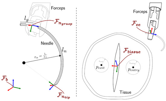 The coordinate frames for the robotic system are defined as shown in Figure 3, where represents the robot arm base frame, is the forceps tip frame, is the needle tip frame, is the frame associated to the needle grasping point, and corresponds to the tissue frame with the z-axis aligned to the tissue surface normal vector. We define relative coordinate frames as where b refers to the local frame and a refers to the reference frame. For notational convenience, a full pose (including position and orientation) in the frame a is denoted by as a combination of a position vector and a rotation matrix . When no reference frame is specified, it is assumed to be expressed in the base frame .